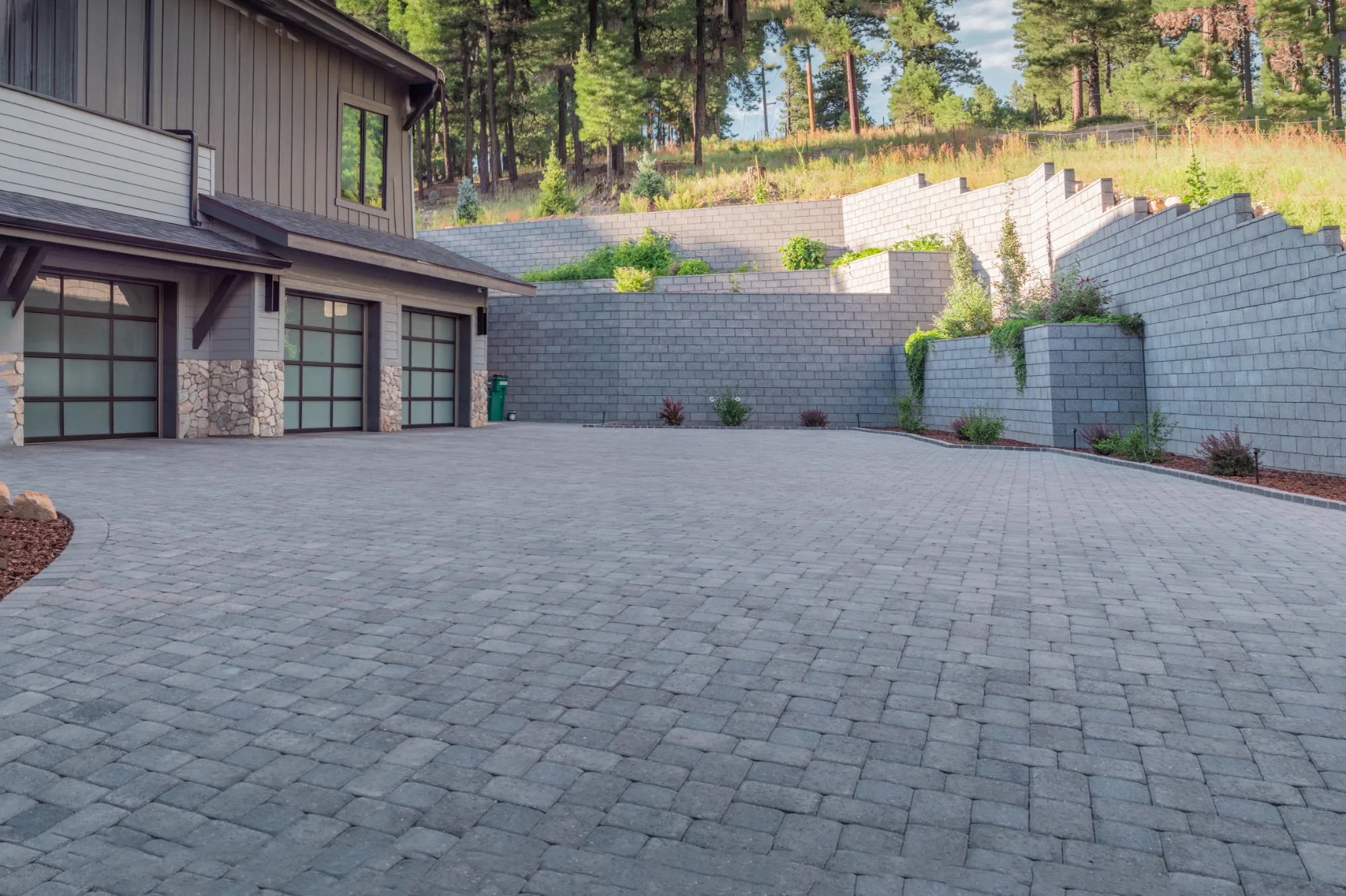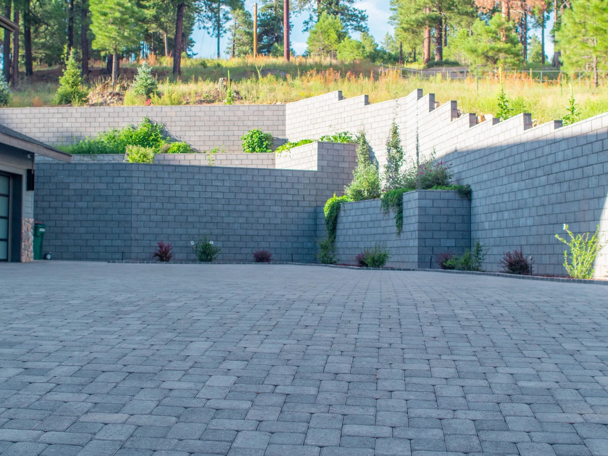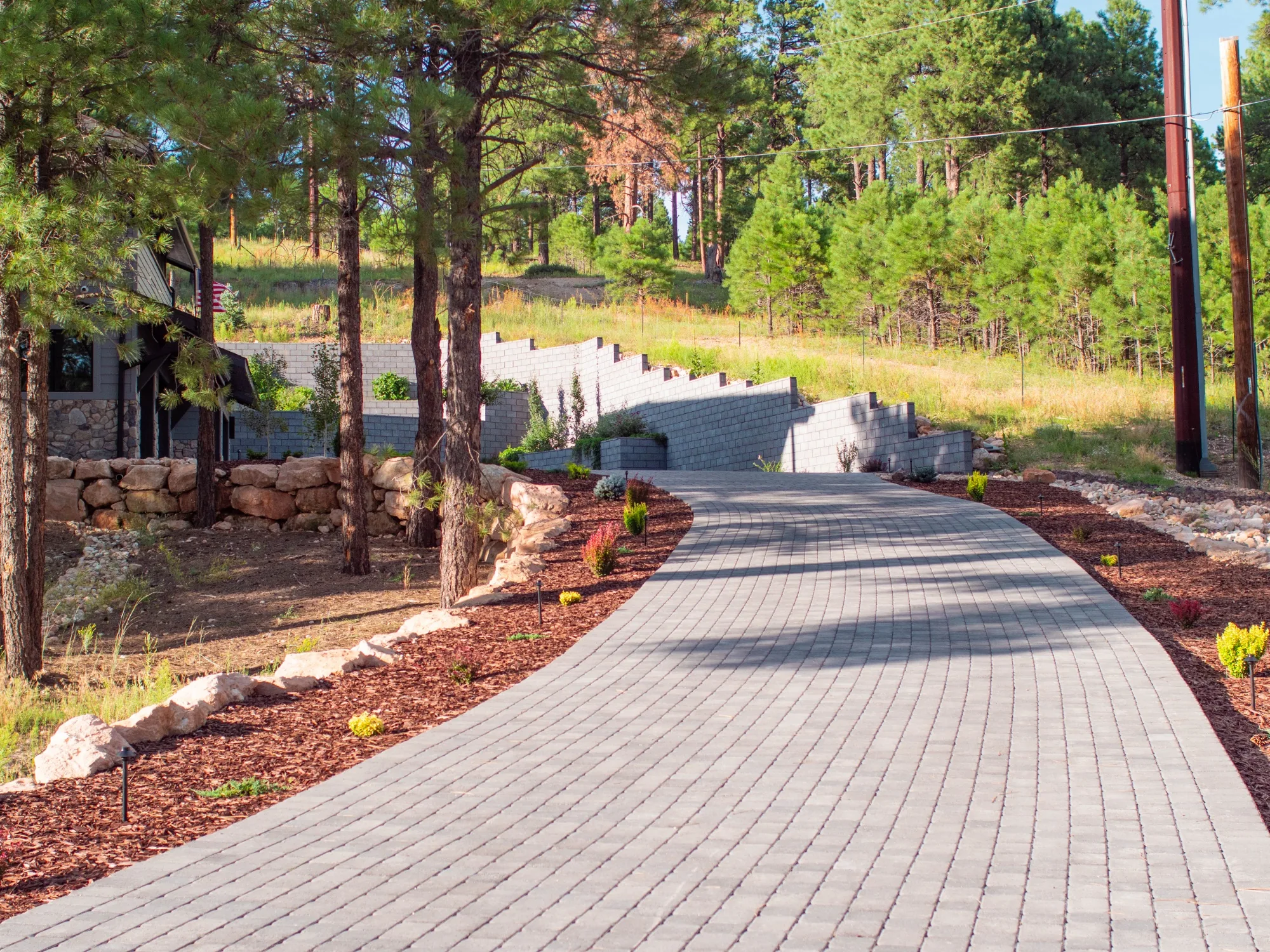 Set among the ponderosa pines of Flagstaff, the Dunlap Residence uses Ground Face CMU in Ebony to carve functional outdoor living space from a challenging hillside site. Tiered retaining walls step up the slope in clean, dark courses — structurally resolving significant grade changes while creating garden terraces, a paver motor court, and a sheltered backyard. Built by Ricardo’s Masonry, the execution is tight: consistent coursing, clean corners, and smooth transitions between elevation changes that make a complex site feel effortless.